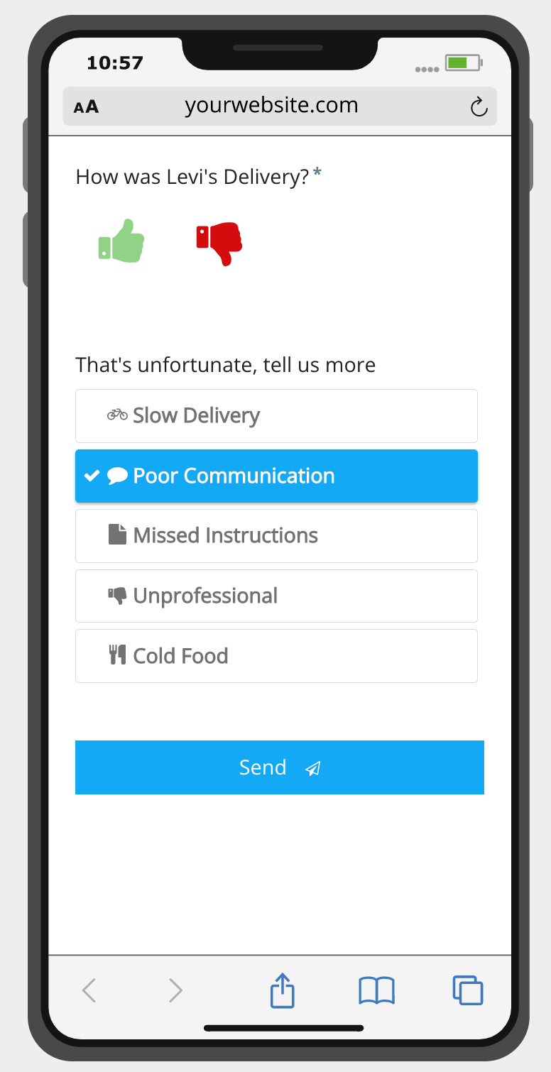 Een survey zoals deze is belangrijk om meer te weten te komen over de emoties en gevoelens van de klant, nadat hij het koopproces heeft voltooid. Door je klanten na de aankoop te vragen naar hun tevredenheidsniveau, krijg je direct inzicht in hun ervaring en kun je vroegtijdig pijnpunten identificeren. Veelvoorkomende vragen zijn bijvoorbeeld ‘Hoe snel was de levering?’ en ‘Was het gemakkelijk om uw vlucht te boeken?’’